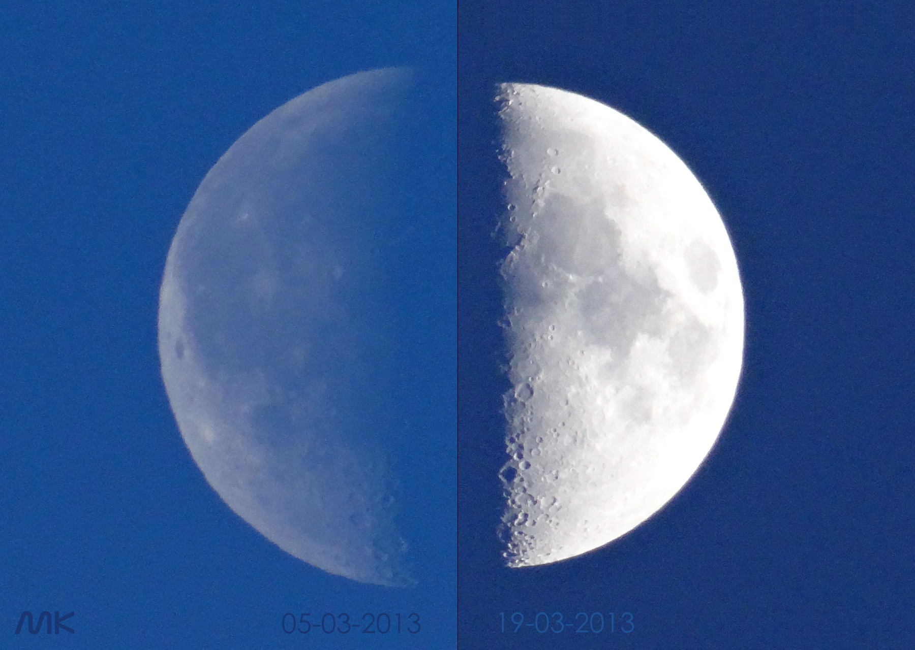Die linke Aufnahme des Halbmonds entstand am 5. März 2013, als der Mond nahe dem Perigäum seines Orbits, also dem erdnächsten Punkt, stand. Das rechte Bild wurde (mit gleicher Brennweite) 14 Tage später, am 19.3. aufgenommen, als der Mond das Apogäum seines Orbits erreicht hat. Der Größenunterschied ist deutlich zu sehen. Besonders gefreut hat mich an diesen Aufnahmen, dass sich der Mond genau an diesen (lang erwarteten) Daten zeigte, obwohl der ganze März quasi durchweg bewölkt war.