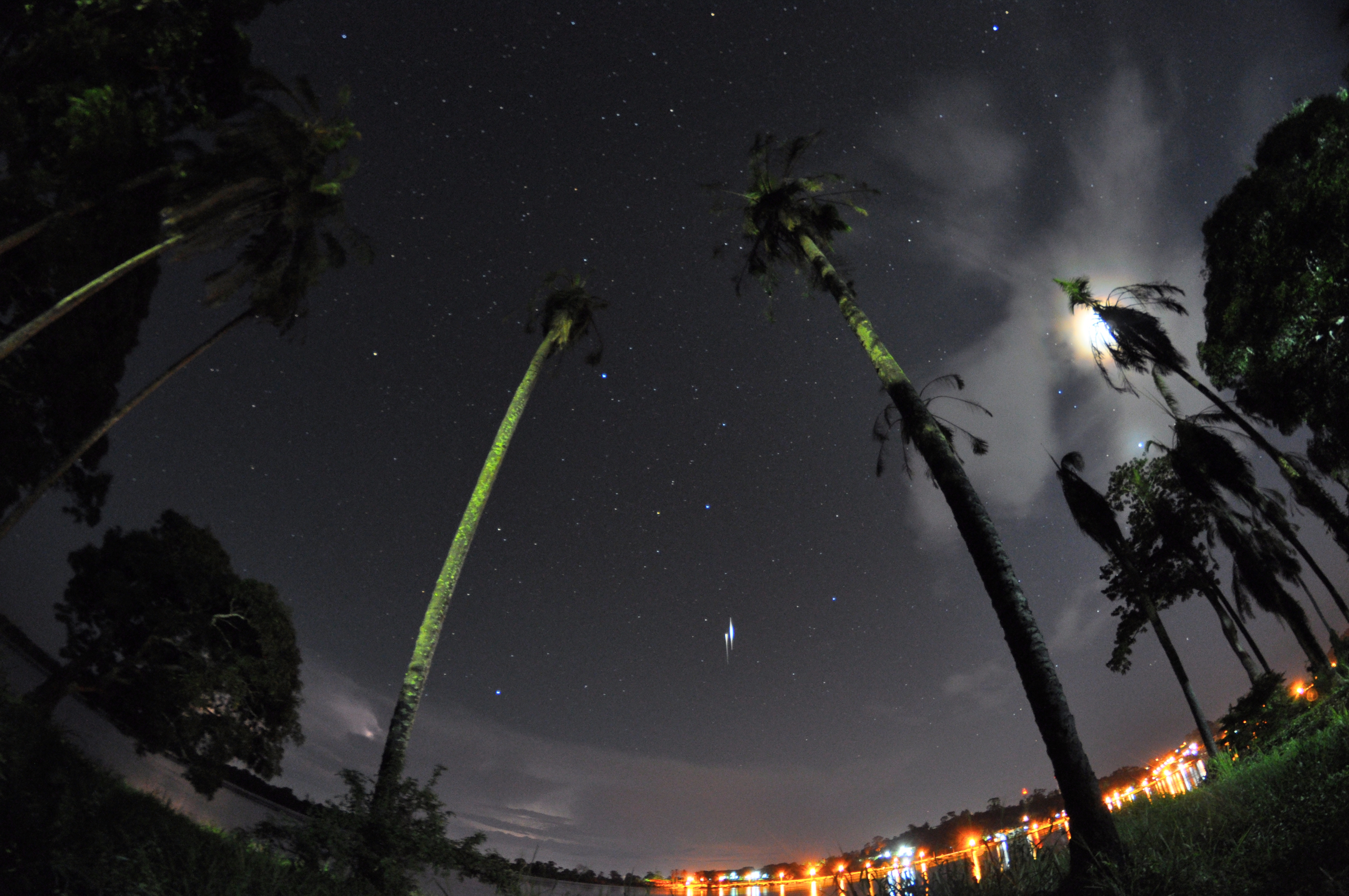 Ich wollte einfach nur Zeitraffer-Aufnahmen des Sternenhimmels, der Wolken, des Oogue-Flusses und der nahen Stadt Lambarene machen. Bei der Auswertung der Bilder fielen mir die beiden senkrechten Flares auf, die ich zunächst für Reflexionen hielt. Eine spätere Recherche bei Calsky ergab, das es sich um die beiden Iridium-Satelliten 51 und 7 handelte, die im Abstand von 10 Sekunden aufblitzten. Die beiden Flares waren sichtbar zwischen den Sternbildern Tukana und Indianer.
