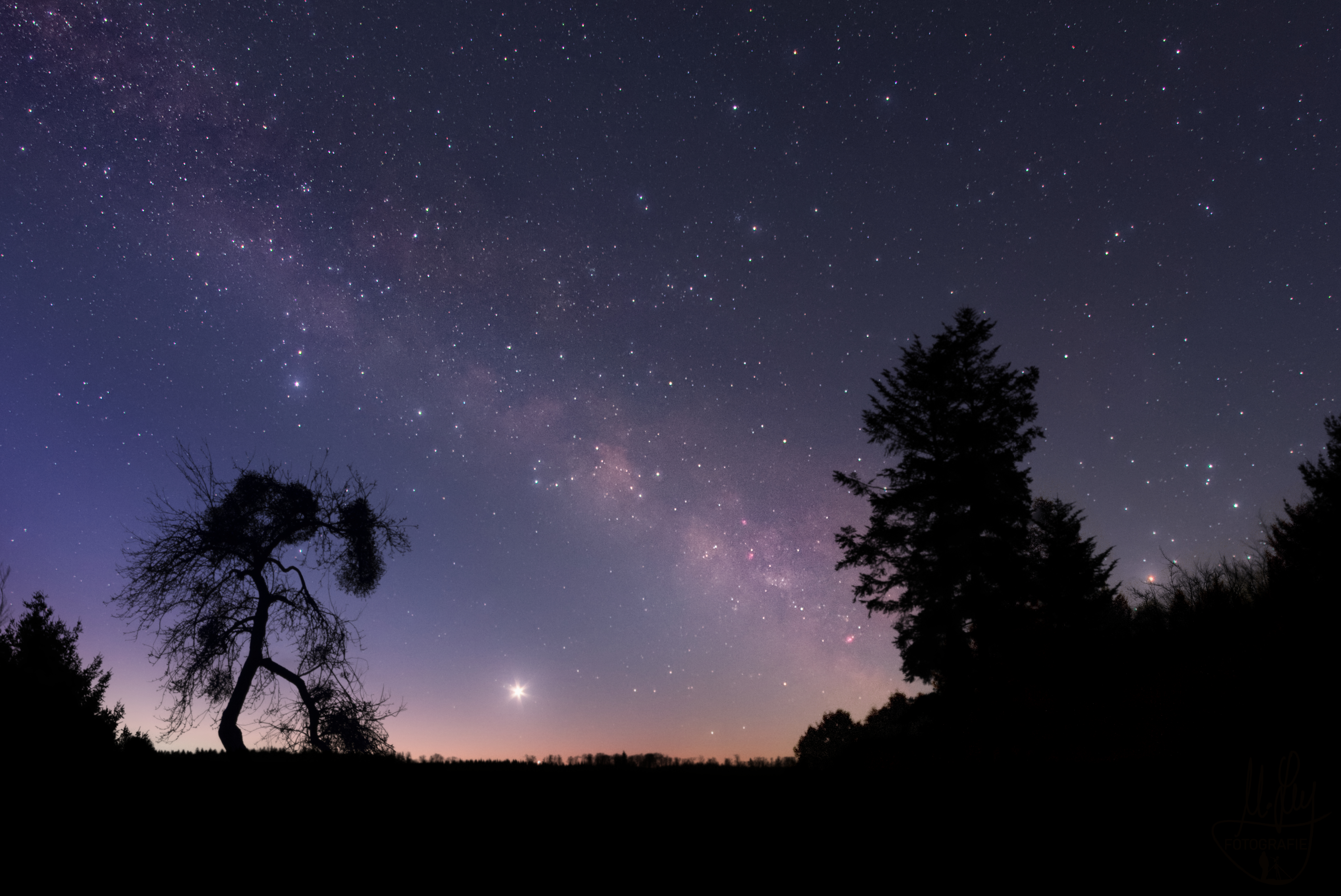 | Belichtungszeit | 20 Sekunden, ISO 800, Blende 2,8. 10 nachgeführte Aufnahmen für den Sternenhimmel und 5 Aufnahmen für den Vordergrund |