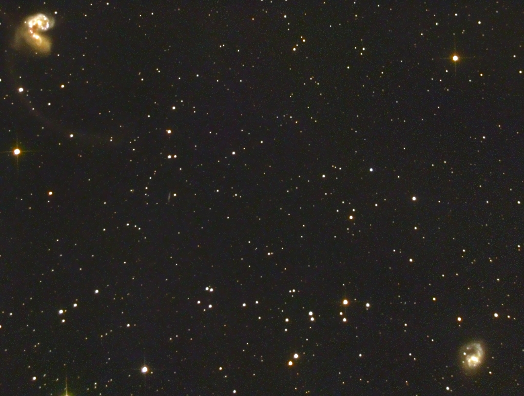 Einmalig scheint es zu sein, dass zwei prominente ARP Objekte so nahe – nur 41 Bogenminuten – nebeneinander zu sehen sind. Die wahre Entfernung der Antennengalaxie NGC 4048/4039 (Arp 244) wird mit 66 Millionen Lichtjahren angegeben, die von NGC 4027/4027A (Arp 22) mit 70 Millionen Lichtjahren. Beide befinden sich vier Grad westlich von Gienah (Gamma Corvi, 2,5 mag). Zufällig passen sie diagonal auf den Chip meiner alten SXV H-9 CCD Kamera. Fast sieben Stunden Belichtungszeit LRGB zeigen auch mit dem kleinen 6-Zoll-Newton viel Detail.