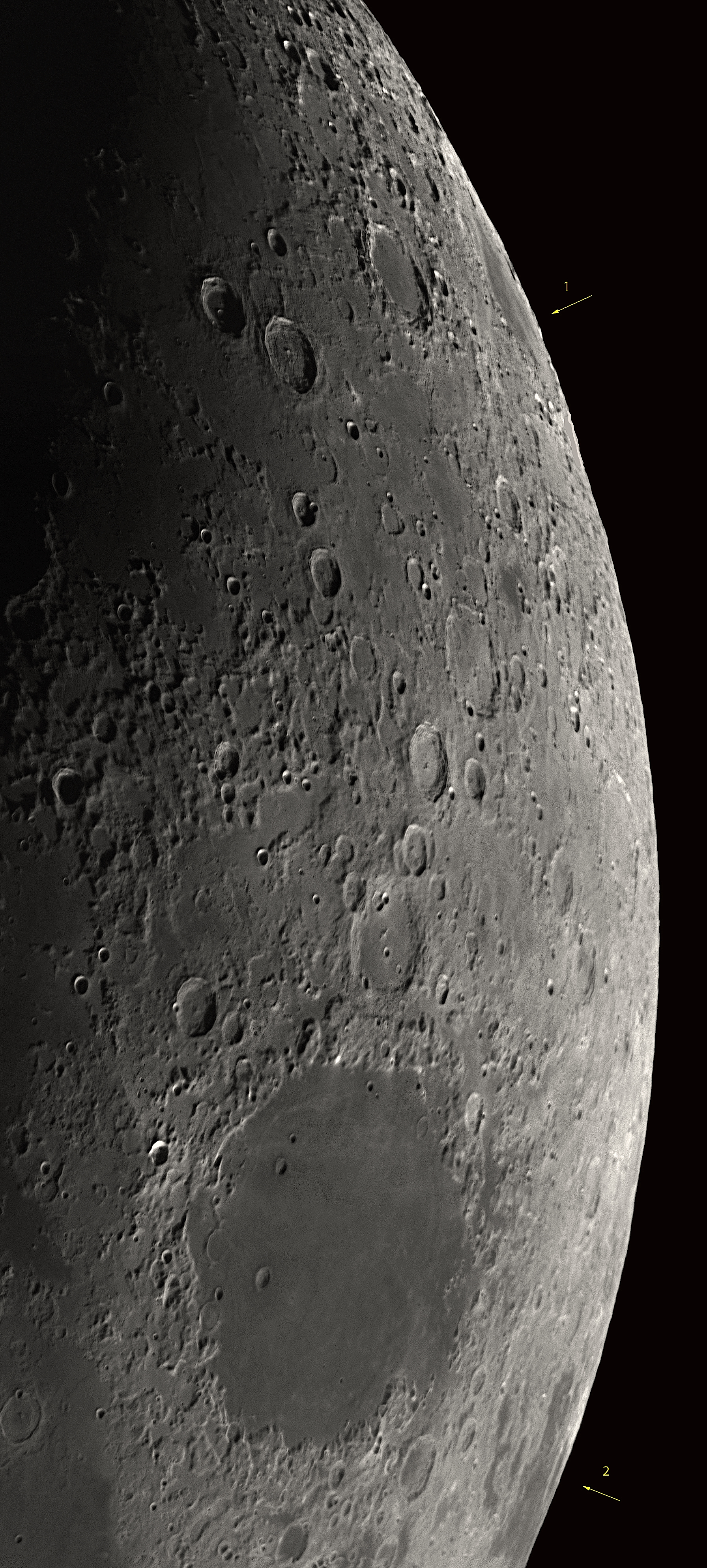 Bei sehr günstiger westlicher Libration waren am 7. Juli 2016 die beiden Randmeere Mare Humboldtianum (1) und Mare Marginis zu sehen. Das Seeing war mittelprächtig. Panorama aus vier Bildern.