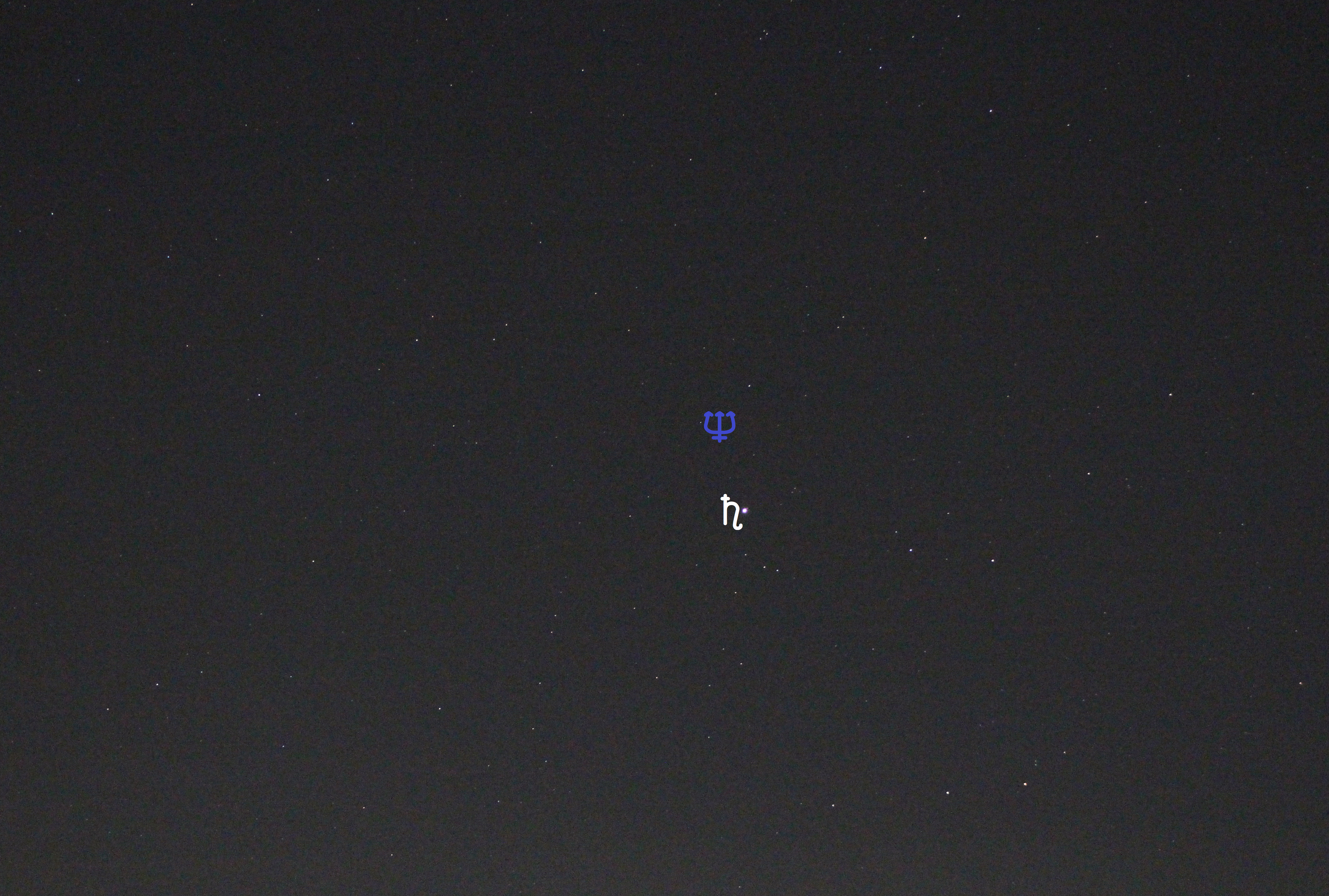 Nachdem ich das letzte Bild gepostet habe, verzogen sich die Wolken wieder und ich konnte die zweite Konjunktion zwischen Saturn und Neptun - diesmal mit längerer Brennweite - fotografieren.