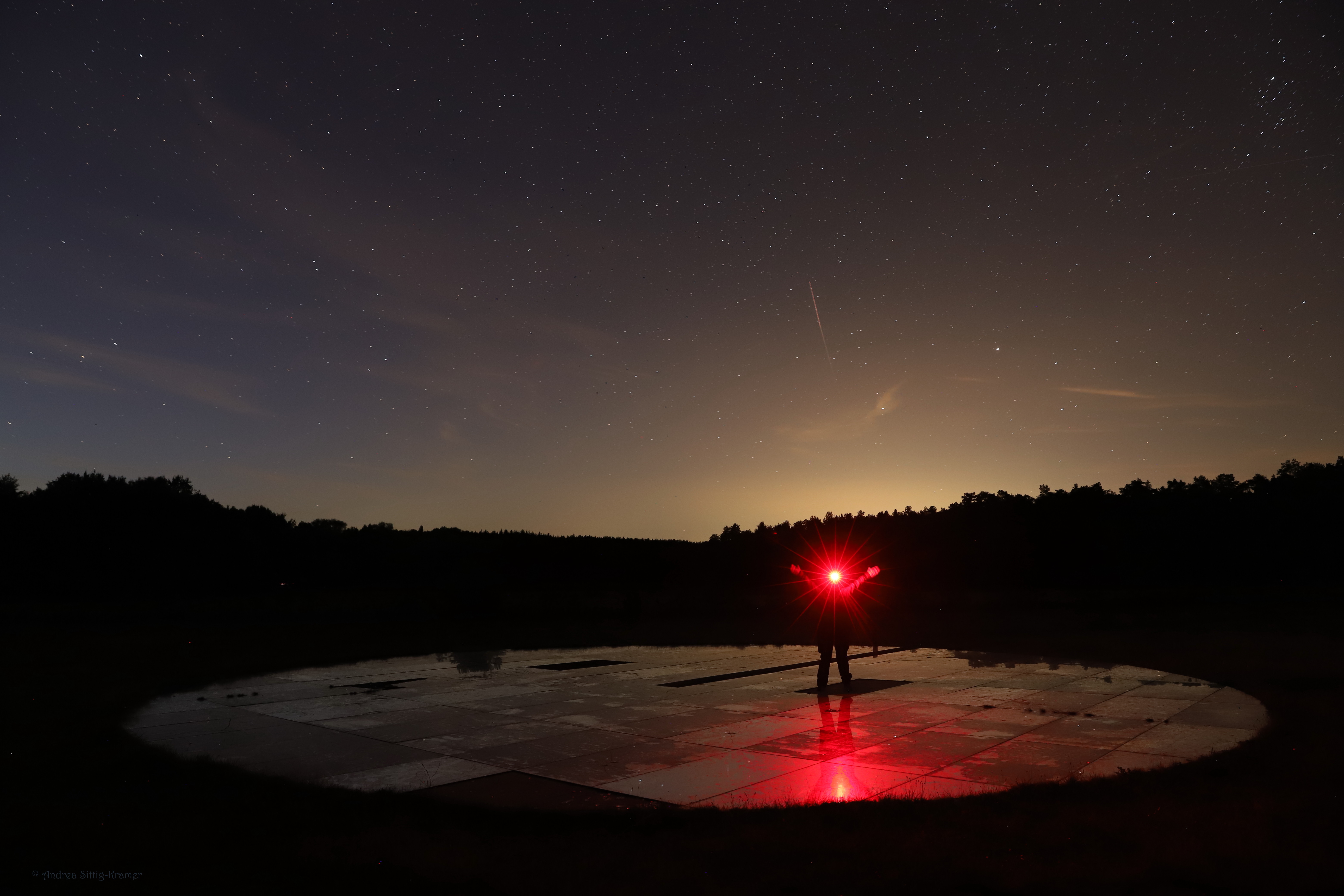 In der Lüneburger Heide unweit von Neunkirchen bei Soltau sind mehrere Landschaftskunst-Objekte zu bewundern. Unter anderem liegt im Heideboden ein Riesenspiegel des russischen Künstlers Valerij Bugrov. Das Kunstwerk trägt den schönen Namen »Himmel und Erde«. Auf dem gezeigten Bild, dass ich mit dem Selbstauslöser aufnahm, stehe ich mit meiner Rotlicht-Stirnlampe auf dem Spiegel: Andrea zwischen Himmel und Erde - auf »Himmel und Erde«.