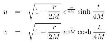 Namen bekannt geworden sind. Die Unzulänglichkeit von Eddington-Finkelstein-Koordinaten besteht offensichtlich darin, dass sie nicht global die Schwarzschild-Geometrie beschreiben. So suchte man ein Koordinatensystem, das sich in der gesamten Raumzeit gut ('nicht pathologisch') verhält und fand es in den Kruskal-Szekeres-Koordinaten (1960). Hier werden radiale und zeitliche Koordinate zugunsten der neuen Koordinaten für ein- und auslaufende, radiale Nullgeodäten aus den Eddington-Finkelstein-Koordinaten aufgegeben. Diese werden abermals mit Exponentialen korrigiert, um pathologisches Verhalten am Horizont auszuräumen. Schließlich wird dafür gesorgt, dass es keine Nullkoordinaten sind, sondern die neue radiale Koordinate vom Typ her raumartig und die neue Zeitkoordinate zeitartig bleibt. Dann erhält man die Kruskal-Szekeres-Koordinaten und das Linienelement der Schwarzschild-Lösung in Kruskal-Szekeres-Koordinaten. Das Erstaunliche in diesem Koordinatensystem ist, dass man nun nicht mehr eine Singularität (definiert durch r = 0) hat, wie in den historischen Schwarzschild-Koordinaten, sondern zwei Singularitäten, fixiert durch die Bestimmungsgleichung v2 - u2 = 1. Ebenso korrespondieren zur asymptotisch flachen Region r >> 2M (G = c = 1) zwei solche Regionen, definiert durch u >> +|v| sowie u << -|v|. Diese seltsame Eigenschaft ist ein Hinweis darauf, dass die Schwarzschild-Lösung nur ein Ausschnitt einer größeren Mannigfaltigkeit ist! Daher sind die Kruskal-Szekeres-Koordinaten die maximale analytische Fortsetzung der Schwarzschild-Lösung, wie man in der Fachsprache sagt. Das bedeutet salopp gesagt, dass in diesen Koordinaten die größte Information über die Schwarzschild-Raumzeit steckt. In der Relativitätstheorie heißt die übergeordnete Mannigfaltigkeit, die die Schwarzschild-Lösung einschließt, die Kruskal-Lösung. Diese duale Struktur der Schwarzschild-Geometrie fand J.L. Synge bereits 1950, 10 Jahre vor Einführung der Kruskal-Szekeres-Koordinaten. Wurmloch Kommen wir noch einmal auf die beiden asymptotisch flachen Regionen der Kruskal-Lösung zurück: Weil die die Einstein-Gleichung der ART nur die lokale Geometrie der Raumzeit vorgibt, nicht jedoch deren globale Topologie, kann man die beiden asymptotisch flachen Regionen zu einer einzigen asymptotisch flachen Mannigfaltigkeit 'verbinden'. Dies nennt man auch ein Wurmloch vom Schwarzschild-Typ. In der Literatur kennt man das Schwarzschild-Wurmloch auch als Einstein-Rosen-Brücke. Anti-Frame-Drag Da die Schwarzschild-Lösung gewissermaßen ein Spezialfall der Kerr-Lösung ist (Kerr-Parameter a = 0), können viele Aussagen des nächsten Abschnitts auf die Schwarzschild-Lösung bezogen werden. Von besonderem Interesse ist der Verlauf der Boyer-Lindquist-Funktionen sowie eine Re-Interpretation des Frame-Dragging-Effekts im Schwarzschild-Fall. Denn während eine rotierende Kerr-Raumzeit alles mitzieht (engl. frame dragging), muss eine statische Schwarzschild-Raumzeit alles zum Stoppen bringen am Horizont - einen Vorgang, den man als Anti-Frame-Dragging bezeichnen könnte.