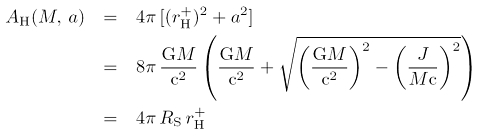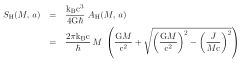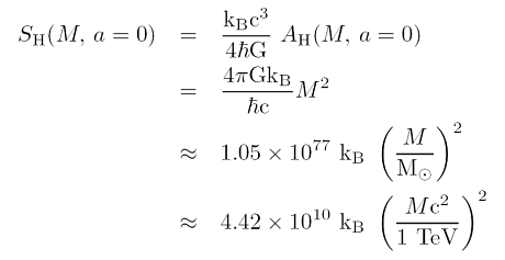 Die Gleichung oben zeigt gerade wie man die Bekenstein-Hawking-Entropie aus der Oberfläche des Horizonts AH berechnet. Wie die Oberfläche von Masse und Drehimpuls abhängt, zeigt die erste Gleichung in diesem Eintrag. Setzt man ein statisches, d.h. nicht rotierendes Schwarzes Loch voraus (a = J/Mc = 0) folgt eine reine Massenabhängigkeit: eine quadratische Skalierung mit der Masse: