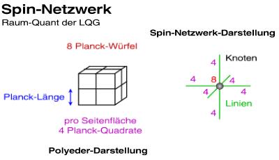 bildet das einfache Spin-Netzwerk in der Abbildung rechts dargestellt. Die Entdeckung der Spin-Netzwerke (engl. spin network) in der LQG war ein wichtiger Schritt für die Theorie (Rovelli & Smolin 1995). Der Begriff Spin-Netzwerk wurde jedoch bereits 1971 von dem englischen Relativisten und Mathematiker Roger Penrose eingeführt, mit der Absicht Mannigfaltigkeiten (in der ART sind das Raumzeiten) eher von einem kombinatorischen Standpunkt zu sehen. Bevor die Spin-Netzwerke Einzug in die LQG fanden, wurden die Loops und Multiloops (ein Zustand aus vielen Loops, die auch überlappen können) als Basiszustände für den Hilbertraum der Theorie herangezogen. Es ist wie in der Quantentheorie: einen beliebigen Quantenzustand kann man in Basiszuständen ausdrücken. Wem das noch nichts sagt: Es verhält sich so ähnlich wie mit beliebigen Zahlen, die man in Potenzen der Zahl 10 zerlegen kann: 123 = 1 × 102 + 2 × 101 + 3 × 100. Spin-Netzwerke stellen eine neue, orthonormale Basis dar. Sie weisen gegenüber den Loop-Zuständen rechentechnische Vorteile auf. So diagonalisieren Spin-Netzwerk-Zustände den Flächen- und Volumenoperator, was sie 'mathematisch handlicher' macht. quantisierte Zeit Es wäre nun zu vereinfachend anzunehmen, dass der Raum aus kleinen Polyedern besteht. Dieser Ansatz trägt der Krümmung des Raumes nicht Rechnung. Außerdem wurde in der bisherigen Betrachtung die Zeitkoordinate vernachlässigt, die doch in der ART ein vernetztes Kontinuum mit den drei Raumrichtungen bildet. Man muss also den Spin-Netzwerken eine zeitliche Entwicklung zugestehen. Wie soll das gehen? Man muss sich das so vorstellen, dass durch diese Entwicklung Knoten im Spin-Netzwerk verschwinden, neue auftauchen, neue Verbindungen geknüpft und alte aufgelöst werden. Ein solches Gebilde heißt Spinschaum (engl. spin foam) und ist in der nächsten Abbildung unten illustriert. Durch die zeitliche Entwicklung werden die Knoten der Spin-Netzwerke zu Linien im Spinschaum, ebenso werden die Linien im Spin-Netzwerk zu Flächen im Spinschaum. In der Abbildung wird eine Zeitrichtung angegeben. Die Zeit sei jedoch auch quantisiert in den fundamentalen Einheiten der Planckzeit, also in 'Zeitpaketen' von 10-43 Sekunden. Damit sei die Zeit in der LQG nicht der sprichwörtliche, kontinuierliche Fluss, sondern eher vergleichbar mit dem Ticken einer Uhr: Wie der Zeiger auf dem Ziffernblatt der Uhr mache die Zeit Sprünge! Bei diesen 'Zeitsprüngen' ändert sich die Gestalt des Spin-Netzwerkes schlagartig, instantan. Diese Entwicklung wird sichtbar, wenn man den Spinschaum (in der Abbildung links dargestellt) entlang der Zeitachse in Spin-Netzwerke zerlegt (in Abbildung rechts dargestellt). Mit jedem Zeitquant reformiert sich das Spin-Netzwerk. Oder anders gesagt: Überall dort, wo sich ein ein Spin-Netzwerk neu formiert, tickt einmal eine lokale Uhr!