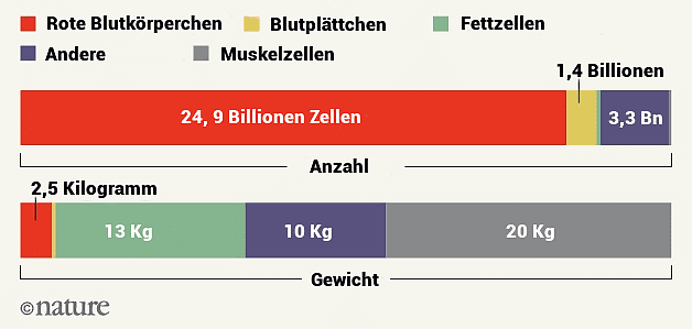 Milo, Sender und Fuchs beschlossen, die Datenlage zu präzisieren, und trugen eine umfassende Übersicht von älteren experimentellen Daten zusammen, die aus allerlei Veröffentlichungen stammen – etwa DNA-Analysen zur Abschätzung der Zellzahl oder aber bildgebenden Magnetresonanz-Studien, bei denen Organgrößen vermessen wurden.