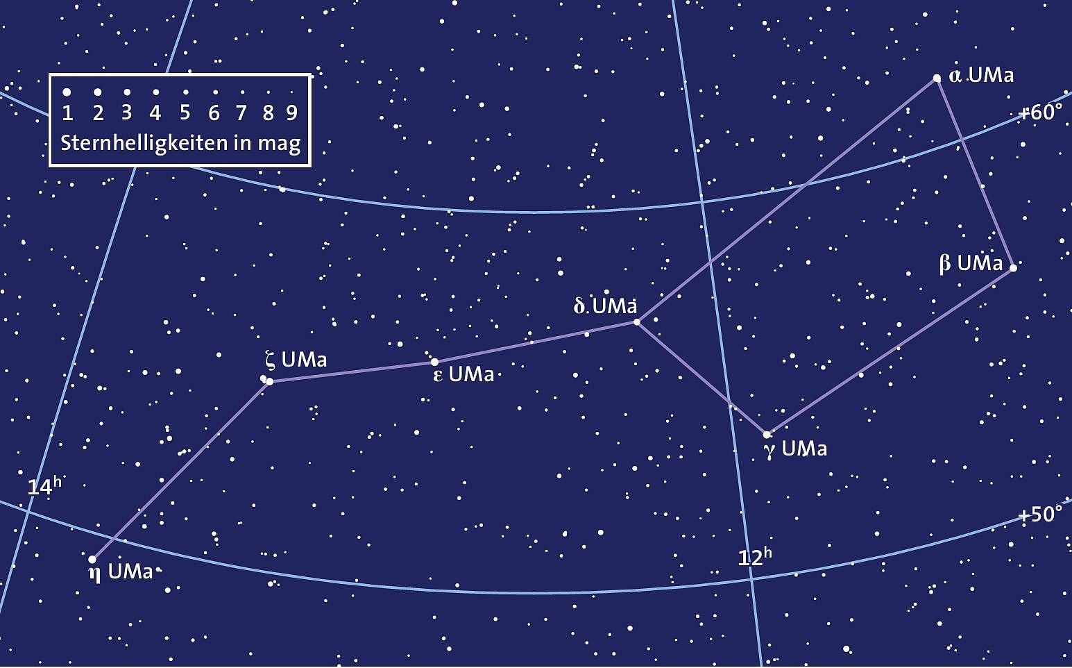 Im Großen Bären wiederum sind die ersten Buchstaben des griechischen Alphabets den sieben hellen Sternen des »Großen Wagens« in der Reihenfolge von West nach Ost, also in Richtung wachsender Rektaszension zugewiesen. Alle sieben gehörten nach Ptolemäus zur zweiten Helligkeitsklasse, obwohl der Stern Delta deutlich lichtschwächer ist als die anderen sechs und im modernen System eine visuelle Helligkeit von nur 3,3 Magnituden hat. Die Namensvergabe ist in dem in »Sterne und Weltraum« 8/2011 vorgestellten Buch »Die Himmelsvermessung des Johannes Bayer« von Jürgen Hamel ausführlicher beschrieben.