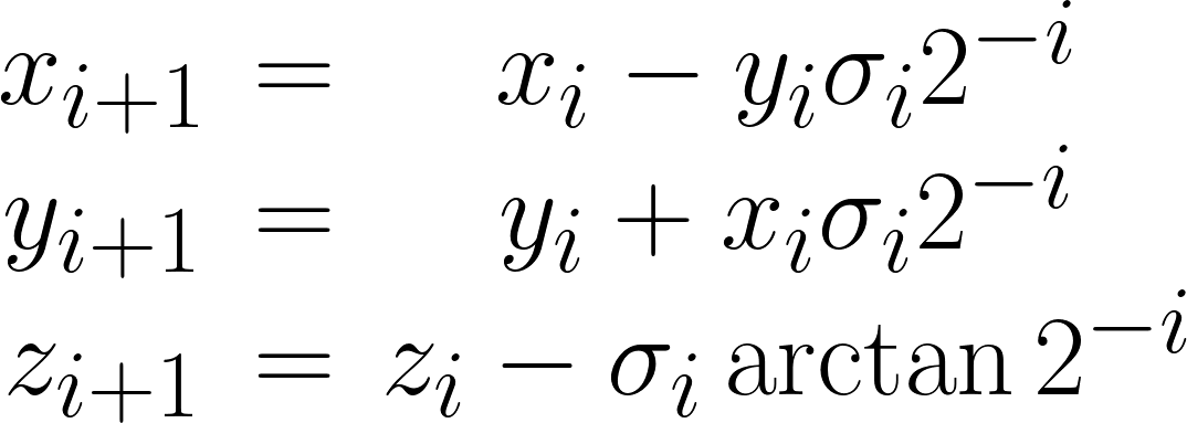 Es geht darum, einen Einheitsvektor, der in der x-Achse liegt, um einen bestimmten Winkel - den Winkel, dessen Kosinus- oder Sinuswert berechnet werden soll - zu drehen. Dazu wählt man passende Teilwinkel und wendet die Rotation iterativ an, wie durch die Formeln oben beschrieben. Eine zu weite Drehung in die eine Richtung wird dabei durch eine Drehung in die Gegenrichtung kompensiert. Um das mathematisch zu realisieren, wurde eine zusätzliche Variable zi eingeführt, deren Wert das Vorzeichen σi festlegt: Ist zi kleiner oder gleich null, dann ist σi gleich -1; sonst +1. Die Werte des Ausdrucks arctan 2-i werden vorab berechnet und im Taschenrechner gespeichert.