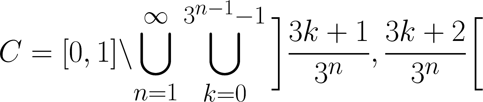 Was hier beschrieben wird, ist eine »Cantor-Menge«, die sich aber viel einfacher in Worten erklären lässt: Man beginnt mit allen Punkten im abgeschlossenen Intervall zwischen 0 und 1. Daraus entfernt man nun das mittlere Drittel, also all die Zahlen, die zwischen ⅓ und ⅔ liegen. Nun bleiben zwei Intervalle übrig, nämlich das von 0 bis ⅓ und das von ⅔ bis 1. Mit diesen verfährt man wie zuvor: Jedes wird in drei Drittel geteilt und das mittlere davon entfernt. Nun hat man vier Intervalle übrig, mit denen man den Prozess wiederholt. Das Ganze passiert unendlich oft - und man könnte annehmen, dass man auf diese Art und Weise dann alle Zahlen zwischen 0 und 1 entfernt hat.