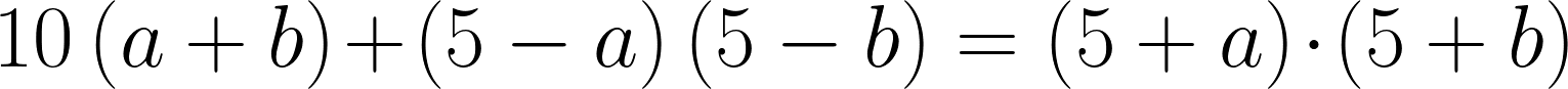 Mit ein wenig Übung kann man so sehr schnell zwei Zahlen zwischen 5 und 10 miteinander multiplizieren, selbst ohne das entsprechende Einmaleins zu beherrschen. Dass das Ganze auch mathematisch korrekt ist, zeigt die Formel oben. a und b stehen für die Zahl der eingeknickten Finger der linken und der rechten Hand – und damit (5 + a)·(5 + b) für die durchzuführende Multiplikation. Die Rechnerei mit den Fingern wird auf der linken Seite der Gleichung formuliert. Es ist nicht schwer, sich davon zu überzeugen, dass die Formel tatsächlich korrekt ist.
