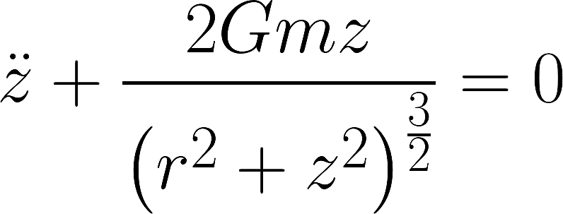 Die beiden Hauptkörper bewegen sich in einer Ebene unter ihrem gegenseitigen Gravitationseinfluss um ihren gemeinsamen Schwerpunkt. Der dritte Körper bewegt sich jedoch senkrecht zu dieser Ebene entlang einer Linie auf und ab, die genau durch den Schwerpunkt führt. Die Gleichung beschreibt den vereinfachten Fall, in dem beide Hauptkörper die gleiche Masse (m) haben; das Folgende gilt aber auch für den allgemeinen Fall. Mit r wird der Abstand der Sterne vom Massenmittelpunkt beschrieben, und die Bewegung des Planeten kann dann mit nur einer Koordinate (z) angegeben werden, dem Abstand vom Schwerpunkt der Sterne.