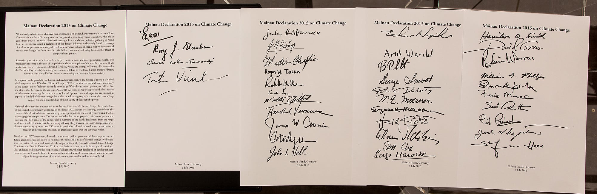 Schon 2009 unterzeichnete eine sogar noch größere Zahl von Nobelpreisträgern – darunter auch solche für Frieden und Literatur, aber auch Unterstützer der Erklärung von heute – einen Appell mit ähnlicher Botschaft: das "St. James's Palace Memorandum". Sechs Monate vor dem Klimagipfel der Vereinten Nationen in Kopenhagen sollte es ein deutliches Signal an die Teilnehmer der Konferenz senden. Doch diese scheiterte – lediglich das oft genannte Zwei-Grad-Ziel wurde seinerzeit anerkannt. Seitdem ist es nicht gelungen, eine völkerrechtlich verbindliche Klimaschutzpolitik zu erreichen. Eine solche Regelung soll endlich auf der UN-Klimakonferenz im Dezember 2015 in Paris beschlossen werden. Das interdisziplinäre Lindauer Treffen lag also günstig für die Mainauer Deklaration.