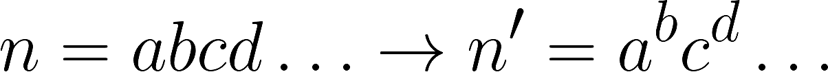 Mit »n« wird hier eine beliebige natürliche Zahl bezeichnet, die durch die Ziffern a, b, c, d und so weiter im Dezimalsystem dargestellt wird. Bei der Zahl 3462 wäre also a = 3, b = 4, c = 6 und d = 2. Laut Conways Formel bildet man daraus nun eine neue Zahl n', indem man jede Ziffer zur Potenz der nachfolgenden Ziffer erhebt und diese Potenzen multipliziert (sollte n aus einer ungeraden Zahl an Ziffern bestehen, wird laut Konvention die letzte Ziffer zur Potenz 1 erhoben).