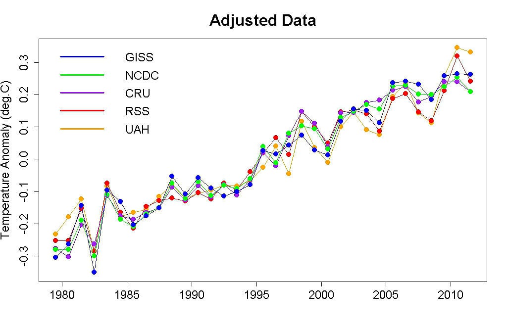 Abbildung 2: Globale Durchschnitts- temperaturen seit 1980 | Die fünf globalen Temperaturdatenreihen nach Bereinigung um drei bekannte Effekte: El Niño, Vulkane und Sonnenschwankungen (mit Amplitude 0,04 Grad Celsius). Die blaue Kurve zeigt die oben schon gezeigten NASA-Daten der Oberflächentemperatur von Wetterstationen, rot und orange sind Satellitendatensätze. Ein noch unerklärter zusätzlicher Sonneneffekt auf die Temperatur, der hier zu Abweichungen vom linearen Anstieg führen müsste, ist nicht ersichtlich.