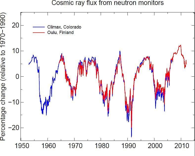 Gegen die Svensmark-Hypothese spricht weiterhin, dass sich ja nach Abzug der schon bekannten schwachen Sonnenschwankungen keinerlei Residuum in den Temperaturdaten zeigt (siehe Abbildung 2), das auf einen zusätzlichen, bislang nicht bekannten Sonneneffekt in der globalen Temperatur hinweisen würde. Die in Korrelationsanalysen gefundene Reaktion der globalen Temperatur entspricht schon der Erwartung ohne den Svensmark-Effekt. Und nicht zuletzt: Selbst wenn die kosmische Strahlung die Wolkenbildung und Temperatur beeinflussen würde, könnte damit bestenfalls eine stärkere elfjährige Schwankung, aber kein starker Klimatrend verursacht werden. Denn die kosmische Strahlung wird seit 60 Jahren gemessen und weist keinen nennenswerten Trend auf (Abbildung 3).