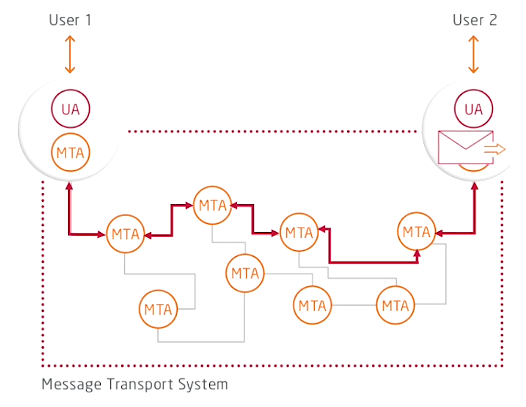 Das E-Mail-System selbst besteht aus mehreren Komponenten: (1) dem Internet als Netzwerkinfrastruktur, (2) den User-Agenten (UA) zum Absenden und Empfangen von E-Mails und (3) den Message-Transfer-Agenten (MTA), die dafür zuständig sind, dass E-Mails über das Internet an den Mailserver mit dem richtigen Postfach geleitet werden.