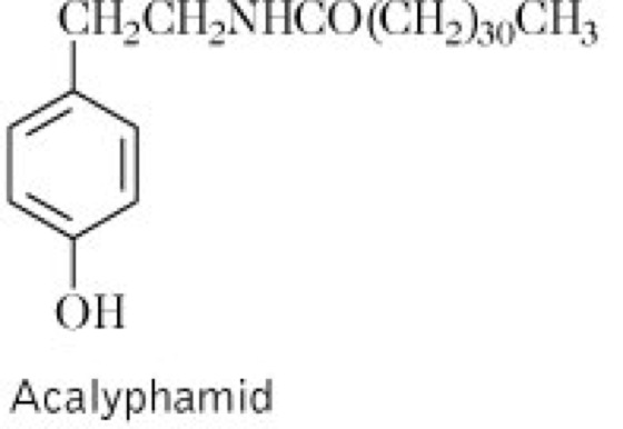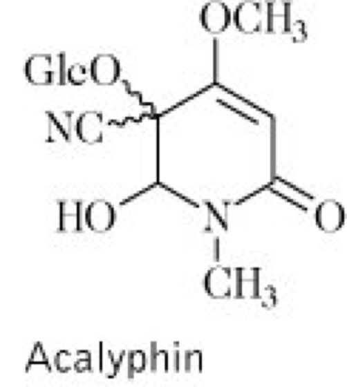 Droge:Herba Acalyphae indicae; Indisches Brennkraut. Inh.: Alkaloide, u.a. Acalyphin vgl. Formel, ein cyanogenes Glykoalkaloid, ferner äther. Öl, phenolische Substanzen (Acalyphamid) vgl. Formel und Harze. Anw.: Expektorans und Diuretikum, heute obsolet.