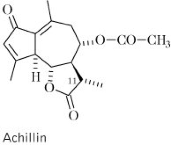 Sesquiterpenbitterstoff (nicht-azulenogenes Guajanolid) im ätherischen Öl von Achillea-Arten.