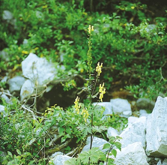 •Aconitum vulparia Rchb. (syn. A. lycoctonum); Gelber Eisenhut (syn. Fuchseisenhut, Gelbe Gelstern, Helmchrut, Hundstod, Wolfs-Eisenhut, Wolfswurz), vgl. Abbildung.