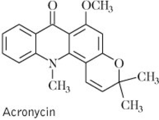 Acronycin Acridonalkaloid. Vork.: in Pflanzen der Familie Rutaceae. Wirk.: Onkolytisch. Induziert Apoptose von Krebszellen. Stärkere Wirkung besitzen die Acronycin-Epoxide.