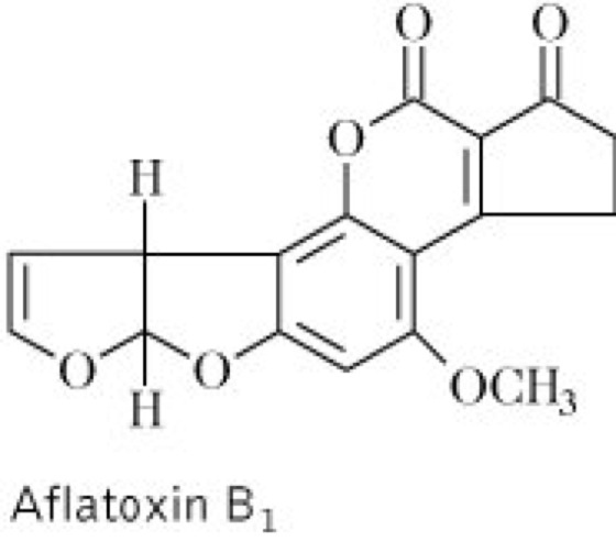 hochgiftige und cancerogene (teratogene) Stoffwechselprodukte (Polyketide) von Schimmelpilzen (Mykotoxine) der Gattungen Aspergillus und Penicillium. Vergiftungen sind möglich durch verschimmelte Nahrungsmittel, bes. fetthaltige Nüsse, Pistazien und Erdnüsse, Getreideprodukte oder Milch von Kühen, die aflatoxinhaltiges Futter aufgenommen haben. Auch verschimmelte Arzneidrogen können A. enthalten. Wirk.: Die toxische Wirkung der A. reicht von lokalen Reizungen bis hin zu schweren Organschäden, wie Leberkrebs. Sie ist auf die Umwandlung der A. in der Leber zu hochreaktiven Epoxiden zurückzuführen, die mit Makromolekülen der Zellen reagieren. Insbes. mit den Guaninbasen der DNA werden Addukte gebildet, die zu Schäden am Erbmaterial führen. Entsprechend ihrer chemischen Struktur unterteilt man die A. in: B1, B2, G1, G2, M1 und M2. Sie sind hitzestabil bis 250 °C, daher sind die A. aus kontaminierten Lebensmitteln und Drogen nicht vollständig entfernbar.