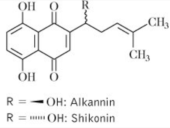 Droge:Alkannae radix (syn. Radix Anchusae, Radix Anchusae tinctoriae, Radix Alkannae spuriae); Alkannawurzel (syn. Schminkwurzel, Alkermeswurzel, Färberkrautwurzel, Rotfärbewurzel, Rote Ochsenzungewurzel), vgl. Abbildung. Inh.:Pyrrolizidinalkaloide (Dihydroxytriangularin, 7-Angeloylretronecin, Triangularin), Naphtochinone (Alkannin-Derivate vgl. Formel Shikonin), Gerbstoffe. Anw.: Volkstümlich wird die Droge als Adstringens zur Behandlung von Hautkrankheiten sowie bei Durchfallerkrankungen eingesetzt. Bedeutsamer ist der Einsatz von Alkannin-Derivaten als roter Farbstoff in der Kosmetik und Lebensmittelindustrie. Aufgrund der carcinogenen, mutagenen, teratogenen und leberschädigenden Eigenschaften der Pyrrolizidinalkaloide ist die Verwendung als Lebensmittelfarbstoff in Deutschland verboten. Auch der Gebrauch der Droge wird wegen der toxischen Pyrrolizidinalkaloide nicht empfohlen.