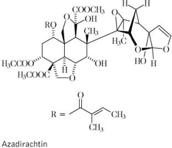 Drogen:1.Cortex Azadirachtae (syn. Cortex Margosae); Indische Fieberrinde (syn. Zedachrinde, Nimrinde). Inh.: Alkaloide, Gerbstoffe, etwas äther. Öl, Nortriterpene, wie Azadirachtin vgl. Formel. Anw.: in den Heimatgebieten, insbes. Indien, als Fieber- und Wurmmittel. 2.Oleum Azadirachtae (syn. Oleum Margosae); Margosaöl (syn. Nimöl), das fette Öl der Samen. Anw.: volkstümlich gegen Hauterkrankungen und als Wurmmittel, technisch in der Seifenfabrikation. 3.Antelaea-Blätter, sie enthalten das Alkaloid Paraisin. Anw.: Insektenvertilgungsmittel.