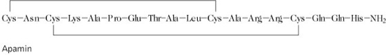 Apamin basisches Peptid aus 18 Aminosäuren, das durch zwei Disulfidbrücken stabilisiert wird. A. wirkt als spezifischer Blocker von Ca2+-abhängigen Kaliumkanälen und wird als Modellsubstanz in der experimentellen Pharmakologie eingesetzt. Es ist in geringer Konzentration im Bienengift enthalten.