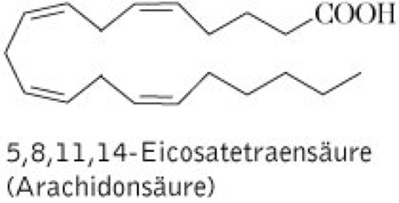 Arachidonsäure Eicosatetraensäure 20:4(5,8,11,14), ungesättigte, essentielle Fettsäure, Ausgangspunkt für die Synthese der Prostaglandine, Thromboxane und Leukotriene (Eicosanoide).