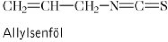 Droge:Armoraciae radix (syn. Armoraciae radix recens, Armoraciae rusticanae radix, Radix Armoraciae, Radix Armoraciae recens); Meerrettichwurzel (syn. Kren, Krenwurzel, Pfefferwurzel), die frische oder getrocknete, im Frühling oder Herbst geerntete Wurzel. Inh.: Frische Wurzel enthält bis zu 0,32 % die Glucosinolate Gluconasturtiin und Sinigrin, aus denen beim Trocknungsprozeß durch enzymatische Spaltung ein äther. Öl (0,6-0,8 %) gebildet wird, das bis zu 90 % aus Allylsenföl vgl. Formel und bis zu 15 % aus Phenylethylsenföl bestehen kann. Weitere Bestandteile sind Ascorbinsäure (ca. 0,6 %) und Vitamin B1 (500 μg/100 g). Anw.: innerlich als Bestandteil entsprechender Phytopharmaka bei grippalen Infekten, bes. Katarrhen der Atemwege und bei Infekten der ableitenden Harnwege. Äußerlich bei leichten Muskelschmerzen sowie bei Bronchitiden. Kontraindiziert ist die Einnahme bei Magen oder Darmgeschwüren sowie bei Nierenleiden. Zur Einahme werden für die Droge als Tagesdosis etwa 20 g frische Wurzel empfohlen.