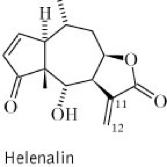 Droge:Arnicae flos (syn. Arnicae-chamissonis-ssp.-foliosa-Blüten); Arnikablüten, die getrockneten, ganzen oder teilweise zerfallenen Blütenstände. Inh.: Sesquiterpenlactone (0,2-1,5 %), v.a. Pseudoguajanolide mit Helenalin- und 11α,13-Dihydrohelenalinester ("Helenaline") vgl. Formel sowie zusätzlich deren 2,3-Dihydro-2α-hydroxyderivate ("Arnifoline") und 2,3-Dihydro-2α,4α-dihydroxyderivate ("Chamissonolide"). Flavonoide (0,4-0,6 %), bes. 6-methoxylierte Flavone und Flavonole, äther. Öl (0,15-0,28 % ), Terpenkohlenwasserstoffe, Thymol, Fettsäuren und n-Alkane enthaltend. Phenolcarbonsäuren mit Chlorogensäure, 1,5-Dicaffeoylchinasäure und 1,4,5-Tricaffeoylchinasäure. Außerdem Cumarinderivate, Polyine und Spuren von Pyrrolizidinalkaloiden (Tussilagin und Isotussilagin). Anw.: s. Arnica-montana-Blüten (Arnicae flos).
