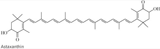 Inh.: Astaxanthin (tierisches Carotinoid) vgl. Formel, β-Carotin, Xanthophyll, Protoporphyrin, 6-8 % fettes Öl, Sterole, Taurin und Glykokoll. In den Greifzangen wurden toxische Proteine und Enzyme gefunden. vgl. Abbildung Anw.: Seesternmehl wird als Futterzusatz in der Schweinemast und als Bestandteil von Torfdünger verwendet.
