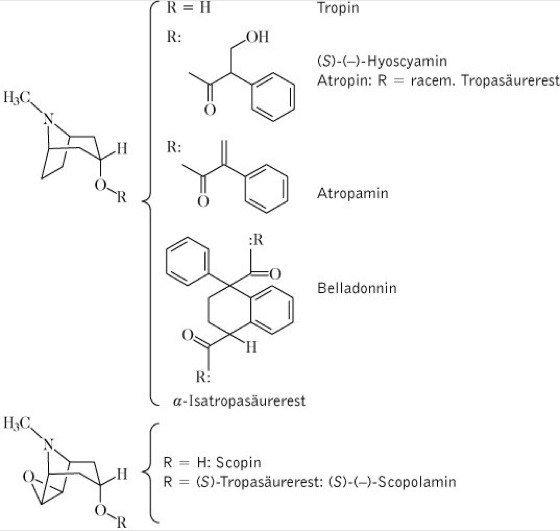 Drogen:1.Belladonnae folium (syn. Belladonnae herba, Folia Belladonnae, Herba Belladonnae); Belladonnablätter (syn. Tollkirschenblätter, Tollkrautblätter, Waldnachtschattenblätter, Wolfsbeerenblätter, Wolfskirschenblätter, Tollkirschenkraut, Tollkraut). Inh.: Tropanalkaloide: Atropin (Racemat aus S-(-)- und R-(+)-Tropasäureester des Tropins) und (-)-Hyoscyamin als Hauptalkaloide, daneben geringe Mengen an Apoatropin, Belladonnin und (-)-Scopolamin; Flavonoide, Cumarine, Gerbstoffe. vgl. Formel Anw.: Durch die parasympathikolytische Wirkung der Tropanalkaloide werden die Drogen zur Spasmolyse im Gastrointestinaltrakt, der Gallenwege, der Harnblase und der Bronchiolen eingesetzt. Außerdem führt Atropin zur Mydriasis und Akkomodationslähmung, es hemmt die Sekretion exokriner Drüsen (Speichel-, Magensaft-, Pankreassaft- und Schweißsekretion) und führt zur Unterdrückung von Übelkeit und Erbrechen. In Dosen ab 3 mg (-)-Hyoscyamin kommt es zur Stimulation des ZNS, ab 10 mg zu zentralen Lähmungen. 2.Belladonnae radix (syn. Radix Belladonnae); Belladonnawurzel. Inh.: Tropanalkaloide (0,3-1,2 %), u.a. Hyoscyamin, Apoatropin, Tropin, Cuskhydrin, Scopolamin. Anw.: s. Belladonnae folium. Darüber hinaus diente die Droge zur sogenannten Bulgarischen Kur, benannt nach dem bulgarischen Wunderheiler Ivan Raeff aus Schipka, die zur Therapie der chronischer Encephalitis genutzt wurde. Diese Anwendung ist heute obsolet.