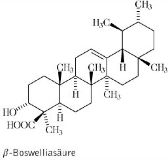 eine Triterpencarbonsäure, die im Harz von Boswellia-Arten enthalten ist. Der Wirkungsmechanismus beruht vermutlich auf der Hemmung der 5-Lipoxygenase und damit der Bildung von Leukotrienen.