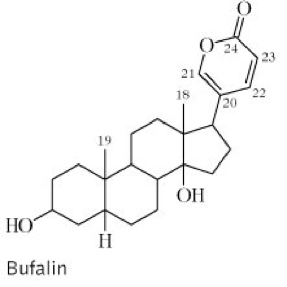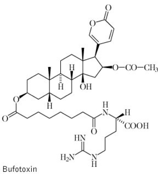 Inh.: Im Sekret der Hautdrüsen (Krötengift) sind herzwirksame Steroide, wie Bufogenine/Bufodienolide, u.a. Bufotoxin vgl. Formel, Bufotalin, Bufotalidin, Bufotalinin und Bufalin vgl. Formel zu finden sowie Alkaloide, wie Bufotenin und Bufotenidin bzw. Catecholamine, wie Adrenalin und Noradrenalin. Anw.: früher zur Anregung der Corticosteroidbildung bei rheumatischer Arthritis, Infektionskrankheiten und Epilepsie, aber auch als Herzmittel bei Herzinsuffizienz.