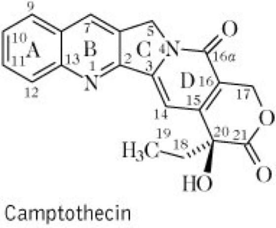 Inh.: in der Rinde, den Früchten und im Holz von C. acuminata ist das Alkaloid Camptothecin vgl. Formel (neben Hydrocamptothecin und Methoxy-camptothecin) enthalten. Wirk.: Camptothecin hemmt die eukaryotische DNA-Topoisomerase I und damit die Zellproliferation. Anw.: Wegen der antileukämischen und cancerostatischen Wirksamkeit wird Camptothecin neuerdings in der klinischen Therapie von Tumoren eingesetzt.