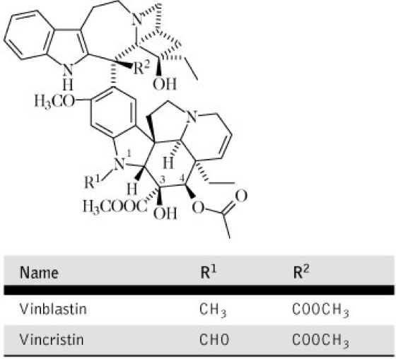 Drogen:1.Vincae rosae herba (syn. Herba Vincae roseae); Tropisches Immergrünkraut und 2.Vincae roseae radix (syn. Radix Vincae roseae); Tropische Immergrünwurzel. Inh.: Alkaloide (mehr als 90), bes. Vincaleucoblastin (Vinblastin, VLB und Vincristin (Leurocristin,LC) vgl. Formel, welche dimere Indol-Indolin-Alkaloide darstellen. Anw.: Die Droge ist ausschließlich Industriedroge und dient zur Gewinnung von Vinblastin und Vincristin, die Mitosehemmstoffe sind und als Zytostatika in der Klinik zur Anwendung gelangen. Vinblastin wird bes. bei Morbus Hodgkin sowie metastasierendem Hoden- und Mammacarcinom eingesetzt, Vincristin bei akuten lymphatischen Leukämien. Infolge erheblicher Nebenwirkungen ist ihre therapeutische Nutzung eingeschränkt. Begrenzender Faktor ist bei VLB neben Übelkeit, Haarausfall, Magen-Darm-Störungen und Beeinträchtigung der Hämatopoese, v.a. die Leukopenie. Die dosislimitierenden Nebenwirkungen beim Vincristin sind bes. Harnsäurenephropathie, Obstipation, Haarausfall und ausgeprägte Neurotoxizität.