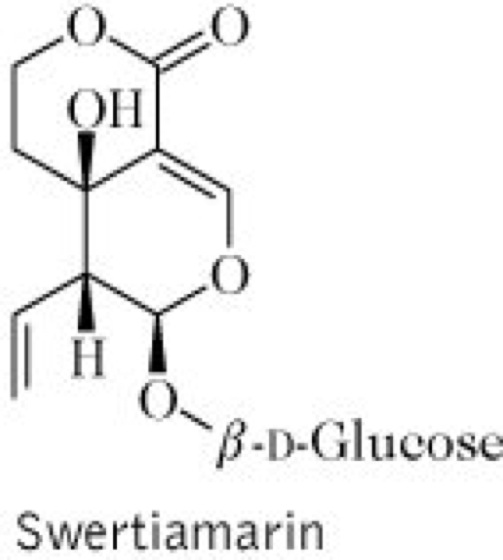 Droge: Centaurii herba (syn. Herba Centaurii, Herba Chironiae, Herba Erythraeae centaurii, Herba Felis terrae, Summitates Centaurii); Tausendgüldenkraut (syn. Bitterkraut, Erdgallenkraut, Fieberkraut, Roter Aurin, Tausendguldenkraut), die getrockneten, oberirdischen Teile blühender Pflanzen. Inh.: Bitterstoffe, v.a. Secoiridoidglykoside, bes. Swertiamarin vgl. Formel, ferner Xanthone, Flavonoide, Triterpene und Phenolcarbonsäurederivate, u.a. Protocatechu-, Syringa-, Kaffeesäure und Ferulasäure. Anw.: Appetitlosigkeit, dyspeptische Beschwerden, Bestandteil von Magentees zur Anregung der Magensaftproduktion. In der Volksheilkunde auch bei Leber- und Galleleiden sowie früher bei Fieber. Geg.: Magen- und Darmgeschwüre. Zur Teezubereitung verwendet man 1-2 g (= 1 Teelöffel) fein zerschnittene Droge.