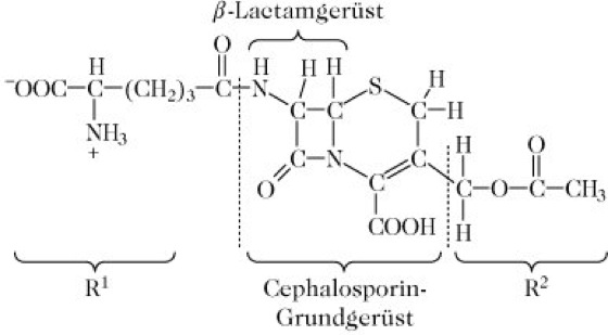 Cephalosporine. Beispiel Cephalosporin C. Die einzelnen Cephalosporinderivate untescheiden sich in den Resten R1 und R2.