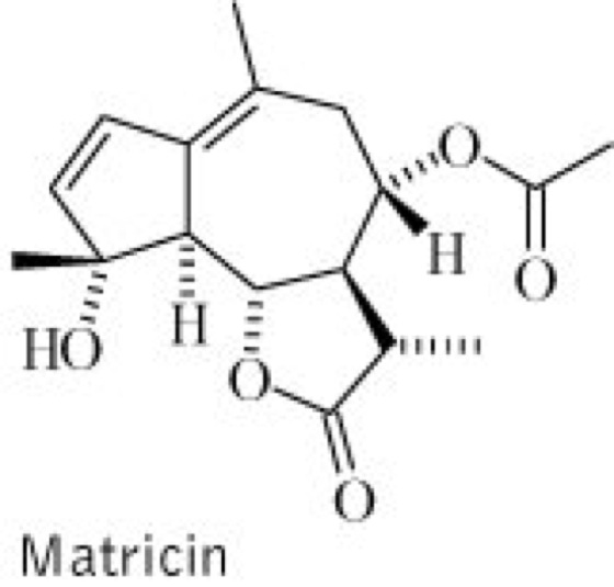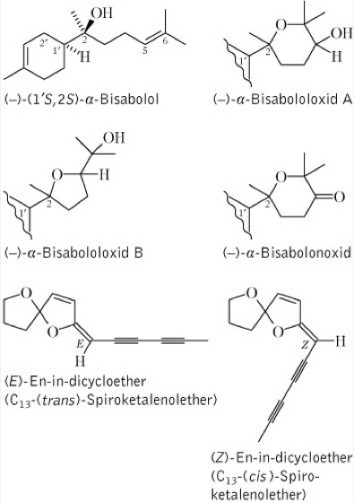 Drogen:1.Matricariae flos (syn. Chamomilla, Chamomillae anthodium, Chamomillae flos, Flores Chamomillae, Flores Chamomillae bulgari, Flos Chamomillae, Flos Chamomillae vulgaris, Matricaria); Kamillenblüten, getrocknete, ganze bzw. teilweise oder vollständig zerfallene Blütenkörbchen und Teile der Blütenstiele. Inh.: äther. Öl (0,3-1,5 %), bestehend aus dem Sesquiterpenalkohol (-)-α-Bisabolol (INN: Levomenol) mit den Oxidationsprodukten Bisabololoxid A, B und Bisabolonoxid (ca 33 %), β-Farnesen (bis 45 %), Polyinen, den sog. En-in-dicycloethern (bis. 25 %) vgl. Formel sowie das nach Wasserdampfdestillation aus dem genuinen Matricin vgl. Formel gebildete Chamazulen (bis 15 %). Weitere Bestandteile der Droge sind Flavonoide, bes. Apigenin- und Luteolin-7-O-glucosid, Cumarine, u.a. Herniarin und Umbelliferon, sowie Schleimstoffe (ca. 10 %). Wirk.: insbes. antiphlogistisch und spasmolytisch. Anw.: innerlich bei entzündlichen Erkrankungen des Magen-Darm-Traktes mit spastischen Beschwerden, bei Leber-und Galleerkrankungen sowie äußerlich bei Haut- und Schleimhautentzündungen, für Bäder im Anal- und Genitalbereich, für Spülungen sowie Dampfbäder bei Erkältungen. Bestandteil zahlreicher Teekombinationen und Arzneifertigpräparate, bes. auch in der Kinderheilkunde. Zur Teezubereitung verwendet man einen gehäuften Eßlöffel (ca. 3γ) als Einzeldosis. 2.Matricariae aetheroleum (syn. Aetheroleum Chamomillae, Matricariae oleum, Oleum Chamomillae); Kamillenöl (syn. Ätherisches Kamillenöl), das äther. Öl aus den Blütenköpfchen. Inh. und Anw.: analog wie Matricariae flos sowie für kosmetische Pflegemittel.