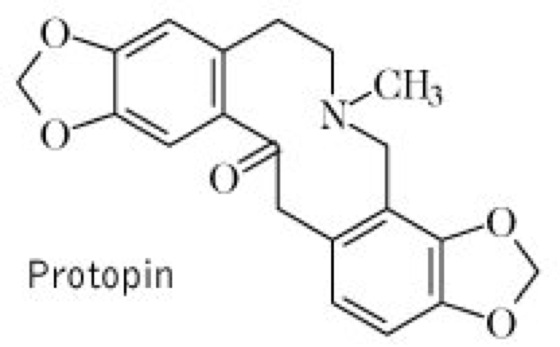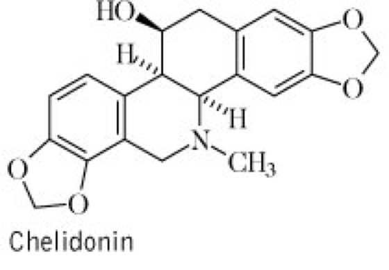Drogen:1.Chelidonii herba (syn. Herba Chelidonii, Herba Chelidonii majoris), die zur Blütezeit gesammelten, getrockneten oberirdischen Teile. Inh.: Alkaloide (0,5-1,5 %), die bevorzugt dem Benzophenanthridin-, Protoberberin- und Protopin-Typ angehören. Hauptalkaloid ist Coptisin, gefolgt von Chelidonin vgl. Formel, Chelerythrin, Protopin vgl. Formel, Sanguinarin, Stylopin und Berberin. Die Alkaloide liegen im gelbgefärbten Milchsaft der Pflanze als Salze, z.T. der Chelidonsäure vgl. Formel, vor. Für die Gelbfärbung sind einige Alkaloidsalze, u.a. die des Sanguinarins, verantwortlich. Wirk.: sehr komplex; u.a. wirken Chelidonin und Protopin spasmolytisch, Berberin cholokinetisch, Chelerythrin zentrallähmend und schleimhautreizend und Sanguinarin als ein Cholinesterasehemmstoff. Anw.: Bestandteil von Leber- und Galletees sowie in Extrakten von diesbezüglichen Phytotherapeutika. Volkstümlich dient der frische Milchsaft zur Behandlung von Warzen, Hornhaut und Hühneraugen. 2.Chelidonii radix (syn. Chelidoniirhizoma, Radix Chelidonii, Rhizoma Chelidonii); Schöllkrautwurzel, die getrocknete, im Spätsommer und Herbst gesammelte Wurzel. Inh.: Alkaloide (1-2 %) ähnlicher Zusammensetzung wie die Krautdroge, allerdings mit Chelidonin als Hauptalkaloid und Magnoflorin, einem Aporphinalkaloid, als zusätzlichem Alkaloid. Anw.: volkstümlich wie Chelidonii herba.