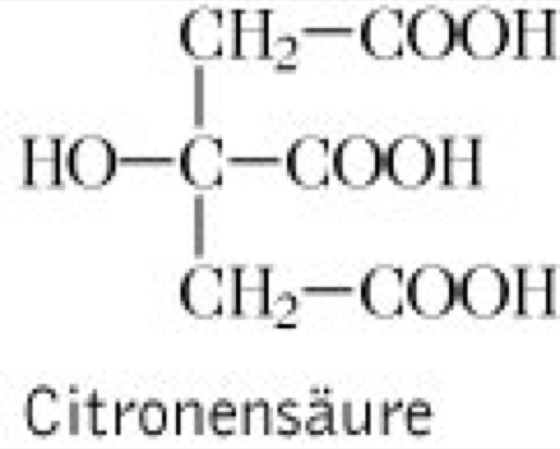 Citronensäure (Zitronensäure), dreibasige Hydroxycarbonsäure (Tricarbonsäure). Als freie Säure und in Form ihrer Salze (Citrate) gehört sie zu den verbreitetsten Pflanzensäuren.