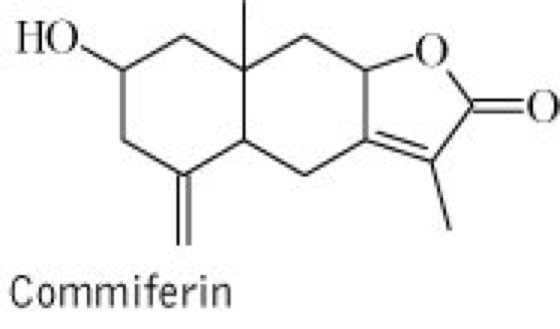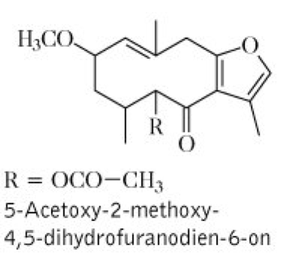 Droge:Myrrha (syn. Gummi Myrrha, Gummiresina Myrrha); Myrrhe (syn. Echte Myrrhe, Somali-Myrrhe), das aus der Rinde ausgetretene, an der Luft getrocknete Gummiharz; vgl. Abbildung. Es kann auch von anderen C.-Arten abstammen, wenn es in der chemischen Zusammensetztung vergleichbar ist. Inh.: äther. Öl (2-10 %) mit Sesquiterpenen (u.a. Sesquiterpenkohlenwasserstoffen, bes. δ-Elemen, 28,8 %) und Furanosesquiterpenen (Germacren-, Eudesmen- Elemen- und Guajen-Typ, wie Commiferin vgl. Formel und 5-Aceto-2-methoxy-4,5-dihydrofiranodien-6-on vgl. Formel als Geruchsträger) als Hauptkomponenten. Nebenbestandteile sind einige Monoterpene, z.B. Limonen, α-und β-Pinen und Phenylpropanderivate, u.a. Zimt- und Cuminaldehyd. Darüber hinaus ist eine Harzfraktion enthalten. Sie besteht aus einem etherlöslichen, einem etherunlöslichen, einem chloroformlöslichen und einem aus Schleimstoffen und Proteinen zusammengesetzten polaren Teil, der etwa 60 % des Harzes umfaßt. Anw.: lokale Behandlung leichter Entzündungen der Mundschleimhaut sowie des Zahnfleisches, meist in Form der Myrrhentinktur. Auch in Salbenform, z.B. zur Verhinderung von Prothesedruckstellen.