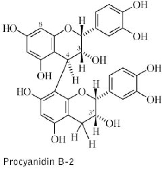 Drogen:1.Crataegi flos (syn. Flores Crataegi); Weißdornblüten, die getrockneten Blüten. Inh.: Flavonoide (ca. 2,5 %), darunter Flavonole, u.a. Hyperosid (0,7 %) und Flavone u.a. Vitexin-2"-O-α-L-rhamnosid (0,2 %), außerdem Procyanidine (ca. 3,7 %) vgl. Formel, die oligomere (ca. 2,5 %) und polymere (ca. 1,1 %) Procyanidine aufweisen. Weitere Bestandteile sind Kaffeesäurederivate, u.a. Chlorogensäure, sowie Triterpensäuren. 2.Crataegi folium cum flore (syn. Folia Crataegi, Herba Crataegi cum floribus); Weißdornblätter mit Blüten, die getrockneten bis etwa 7 cm langen, blühenden Zweigspitzen. Inh.: Flavonoide (ca. 1,8 %), Flavonol- und Flavonglykoside (s.o.), oligomere Procyanidine (ca. 2,4 %), u.a. das dimere B-2, ferner Phenolcarbonsäurederivate und Triterpensäuren, u.a. Crataegolsäure (2-α-Hydroxyoleanolsäure) und Ursolsäure. Anw.: nachlassende Leistungsfähigkeit des Herzens, leichte Formen von bradikarden Rhythmusstörungen, mangelnde koronare Durchblutung. Bestandteil zahlreicher Arzneifertigpräparate, oft in Kombination mit anderen Drogen oder Substanzen, u.a. auch mit Cardenoliddrogen. Zur Teezubereitung verwendet man als Einzeldosis ca.1,8 g (1 Teelöffel) fein zerschnittene Krautdroge. 3.Crataegi fructus (syn. Fructus Crataegi, Fructus Oxyacanthae, Fructus Spinae albae); Weißdornfrüchte, die getrockneten Scheinfrüchte. Inh.: Triterpensäuren (ca. 0,45 %) u.a. Crataegol- und Ursolsäure, Procyanidine (ca. 3 %) sowie Flavonglykoside und C-Glykosylflavone. Anw.: s. Anwendung von Blatt- und Blütendrogen.