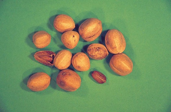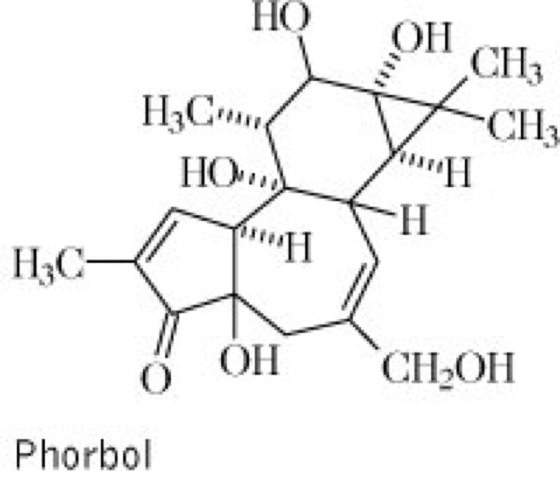 Drogen:1.Crotonis oleum (syn. OleumCrotonis, Oleum Tiglii, Oleum Tilli); Krotonöl (syn. Crotonöl), das aus den geschälten Samen gepreßte fette Öl. Inh.: Fettsäureglyceride mit meist ungesättigten Fettsäuren, wobei Ölsäure die Hauptkomponente unter den Neutralfetten bildet, außerdem Harz (ca. 5 %), das Di- und Triester des Diterpenalkohols Phorbol vgl. Formel enthält. Wirk.: innerlich drastisch abführend, äußerlich bewirken bereits kleine Dosen (1-2 Tropfen) auf der Haut Rötungen, Ödeme und Blasenbildung. Anw.: früher bei sehr hartnäckiger Obstipation in Mischung mit Ricinusöl. Gegenwärtig noch als Bestandteil des sog. Baunscheidtschen Öles als hautreizendes, entzündungserregendes Mittel. Geg.: 10 Tropfen des Öles bewirken bereits heftige Enteritiden, choleraähnliche Durchfälle, Nierenreizungen sowie Kollapserscheinungen. Die letale Dosis liegt bei etwa 20 Tropfen. Die Phorbolester sind zudem Cocarcinogene. 2.Crotonis semen (syn. Semen Cataputiae minoris, Semen Tiglii, Semen Crotonis); Crotonsamen (syn. Purgierkörner), die getrockneten reifen Samen, vgl. Abbildung. Inh.: fettes Öl s. C. oleum, Enzyme, Proteine. Anw.: ausschließlich als Drastikum in der Veterinärmedizin.