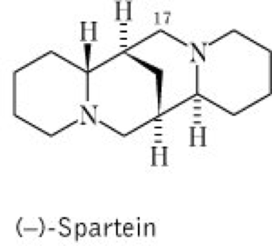 Drogen:1.Cytisi scoparii flos (syn. FloresGenistae, Flores Genistae scoparii, Flores Spartii scoparii, Flos Genistae scopariae, Sarothamniscoparii flos); Besenginsterblüten (syn. Ginsterblüten, Pfriemenblüten), die getrockneten, abgestreiften Blüten. Inh.: Chinolizidinalkaloide (1-2 %, v.a. (-)-Spartein vgl. Formel, 17-Oxospartein, (+)-Lupanin vgl. Formel, Tyramin, Scoparin (8-C-Glykosylchryseriol). Anw.: in der Volksheilkunde bei Wasseransammlungen, Rheuma, Gicht, Nierensteinen, Gelbsucht, Leberleiden und zur Blutreinigung. Da kein gesichertes medizinisches Wissen über die Verwendung der Droge existiert, wird deren alleiniger Gebrauch nicht empfohlen. Als Bestandteil von Kombinationspräparaten ist die Droge in Zubereitung für die Indikationsgebiete Herz-Kreislauf-System und Nierenerkrankungen enthalten. 2.Cytisi scoparii herba (syn. Herba Genistae scopariae, Herba Sarothamni scoparii, Herba Spartii scoparii, Sarothamni scopariiherba, Scoparii cacumina, Scoparium, Summitates Scoparii, Summitates Scoparii Genistae); Besenginsterkraut (syn. Besenstrauch, Ginsterkraut), die getrockneten, besonders im Frühjahr und Spätherbst gesammelten oberirdischen Teile. Die Droge ist apothekenpflichtig. Inh.: Chinolizidinalkaloide (0,5-1,6 %, v.a. (-)-Spartein, 11,12-Dehydrospartein, 17-Oxospartein, Lupanin), Phenylalaninderivate (u.a. Tyrosin, Tyramin, Epinin, Dopamin, Methyloxytyramin), Flavonoide (0,2-0,6 %, u.a. Spiraeosid, Isoquercitrin, Quercetin- und Kämpferolglykoside, C-Glykosyle des Apigenins und Luteolins, Scoparin), Isoflavone (Sarothamnosid, Genistein). Anw.: bei funktionellen Herz- und Kreislaufbeschwerden, zur Unterstützung der Therapie bei Hypotonie und Kreislaufregulationsstörungen. In der Volksheilkunde wird ein Dekokt eingesetzt bei Ödemen, zur Diurese, bei Herzbeschwerden und niedrigem Blutdruck, bei zu starker Menstruation und Blutungen nach der Geburt sowie bei Gicht, Rheuma, Ischias, Gallen- und Harnsteinen, Gelbsucht, Bronchialerkrankungen. 3.Cytisi scoparii radix (syn. Radix Genistaescopariae, Radix Genistae scoparii, Radix Sarothamni scoparii, Radix Spartii scoparii, Sarothamniscoparii radix); Besenginsterwurzel (syn. Ginsterwurzel), die getrocknete Pfahlwurzel mit Nebenwurzeln. Inh.: Chinolozidinalkaloide (0,002 %, u.a. (-)-Spartein, Lupanin, 13-Hydroxylupanin und Nebenalkaloide). Anw.: in der Volksheilkunde bei vergrößerter Milz, Gelbsucht, Rheuma und anderen Leiden.