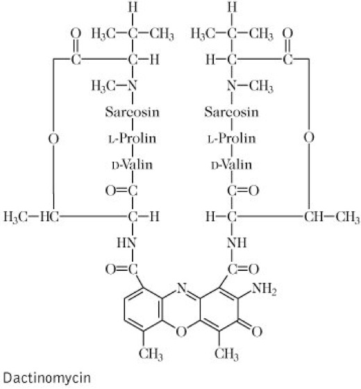 (syn. Actinomycin D oder C1, Meractinomycin). Heteromeres Peptid aus der Gruppe der Peptidlactonantibiotika. Es wird u.a. von Actinomyces antibioticus gebildet und ist in der Lage, im DNA-Doppelstrang zwischen die Basenpaare Guanin-Cytosin zu interkalieren. Anw.: D. wird hauptsächlich als Zytostatikum bei Wilms-Tumoren, Rhabdomyosarkom, Tumore des Hodens und des Uterus eingesetzt. Der Einsatz ist trotz der schweren Nebenwirkungen (u.a. Blutbildveränderungen, Erbrechen, Ekzeme) gerechtfertigt.