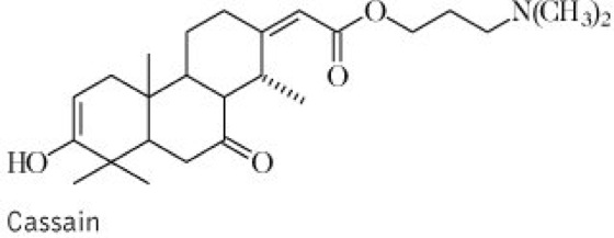 Droge:Cortex Erythrophlei (syn. Cortex Sassy); Rotwasserbaumrinde (syn. Gottesurteilrinde, Sassyrinde), die getrocknete Rinde. Die Droge ist stark giftig! Inh.: Diterpenalkaloide mit herzwirksamer Aktivität, u.a. Erythrophlein, Cassamin, Erythrophlamin, Cassain vgl. Formel, Cassaidin, Coumingin, Coumingidin, Erythrophleguin, Ivorin und Sedachain sowie Cassaminsäure, Norcassamin, Luteolin, Gerbstoffe und Harz. Anw.: in der traditionellen Medizin Afrikas als Herzmittel. Größere Bedeutung hatte die Droge in früheren Jahren als Mittel zur Herbeiführung von "Gottesurteilen" sowie als Pfeilgift.