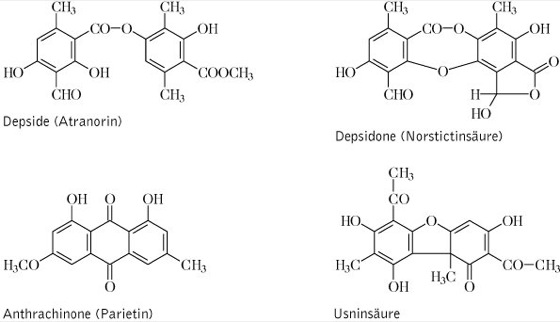 Cyclische Tetraketide (biogenetisch aus 4 Acetatresten aufgebaute Depside und Depsidone), die durch die Pilzanteile (Mykobionten) des Flechtenthallus produziert werden und antibiotische Wirksamkeit gegenüber einem breiten Spektrum von Erregern aufweisen. Dazu gehören u.a. Usninsäure, Atranorin, Norstictinsäure und Parietin, vgl. FormelDepside, Atranorin....